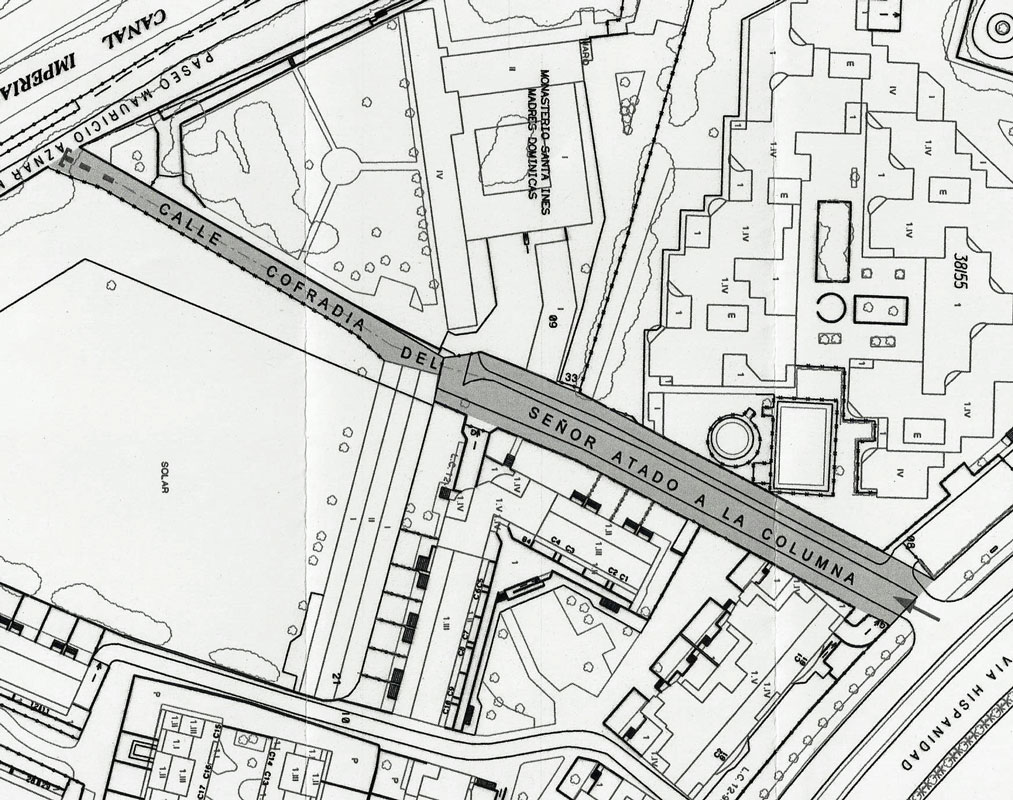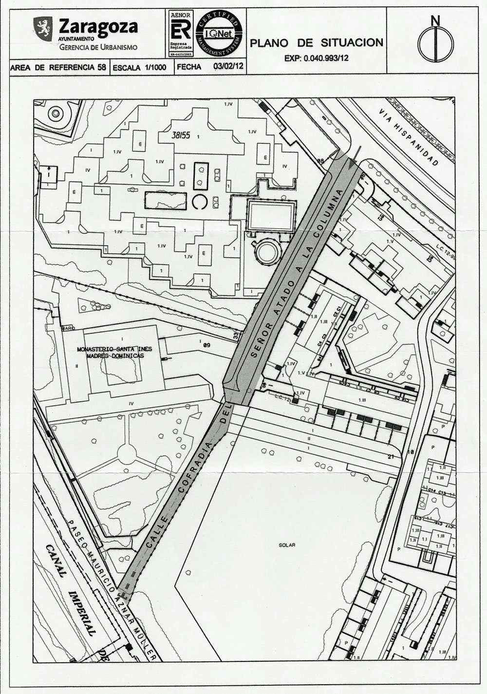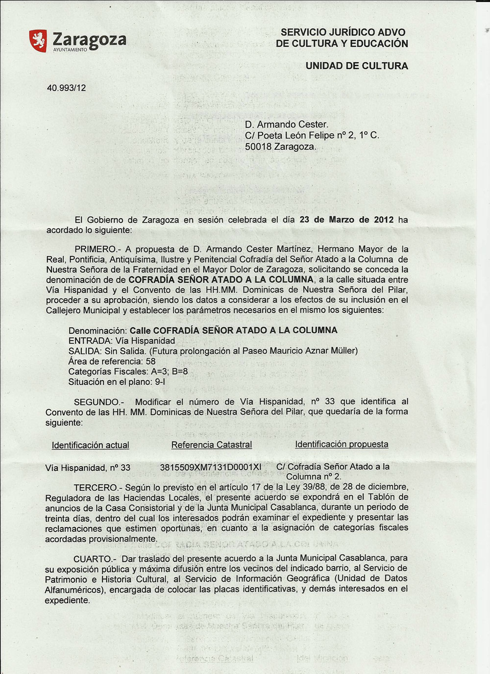 Tenemos la satisfacción de comunicaros que, tras largas y laboriosas gestiones por parte de la Junta de Gobierno y de nuestro Hermano Mayor, el Ayuntamiento de Zaragoza en sesión celebrada el pasado 23 de marzo de 2012, acordó conceder el nombre de nuestra Cofradía a la calle situada entre Vía Hispanidad y el convento de las HH.MM. Dominicas de Nuestra Señora del Pilar. Igualmente os indicamos que, trascurrido el plazo legal correspondiente, la Junta Municipal Casablanca no ha tramitado reclamación o recurso al respecto, por lo que ya podemos hacer público el hecho de que Zaragoza disponga de una calle con el nombre de nuestra querida Cofradía.