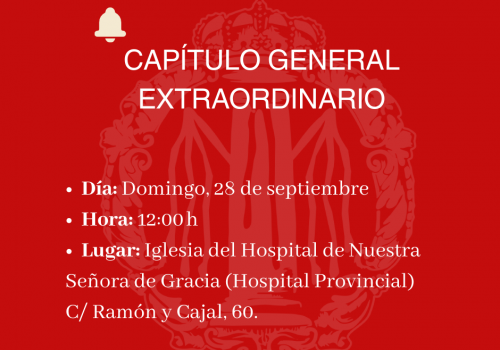 Se convoca a capítulo general extraordinario, el día 28 de septiembre, domingo, a las 12 horas, en la iglesia del Hospital de Nuestra Señora de Gracia (Hospital Provincial), sita en la calle Ramón y Cajal número 60.
