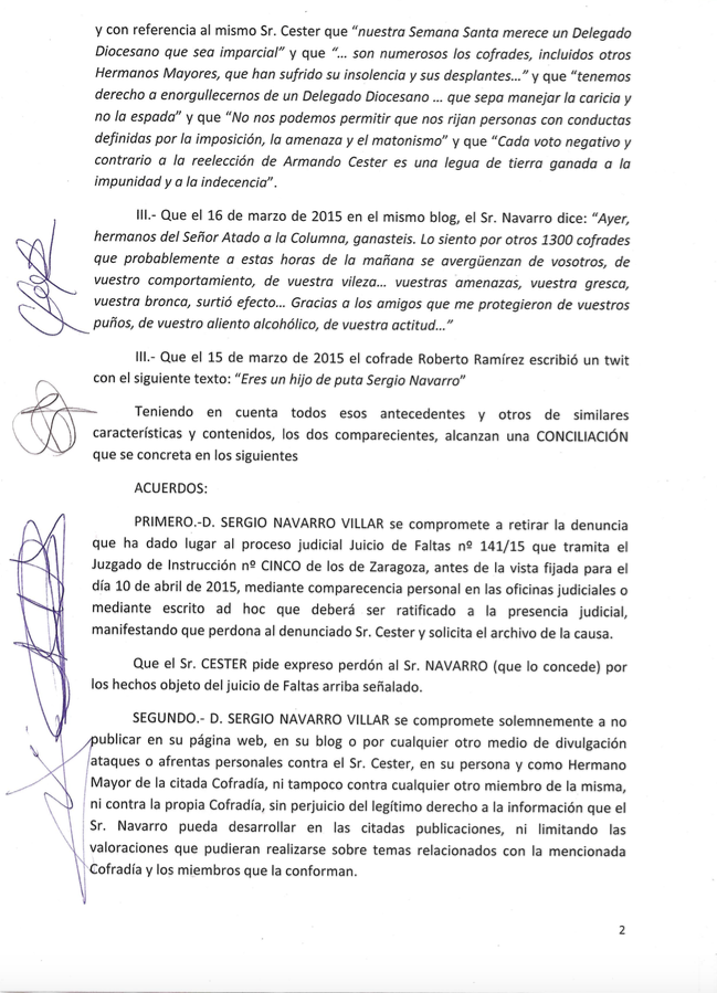 Ayer 10 de abril de 2015 D. Armando Cester Martínez (Hermano Mayor de nuestra Cofradía) y D. Sergio Navarro Villar (Director de la Asociación Cultural Terceroles y de la revista Redobles) procedieron a firmar un acta de conciliación para dar por finalizados los acontecimientos sucedidos en los últimos meses.