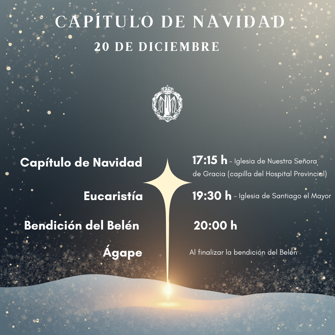 Se convoca capítulo general ordinario de la Cofradía el próximo día 20 de diciembre de 2025, sábado, a las 17:15 horas en primera y segunda convocatoria, en la iglesia de Nuestra Señora de Gracia (capilla del Hospital Provincial con entrada por la calle Santiago Ramón y Cajal número 60), que se desarrollará con arreglo al siguiente orden del día: