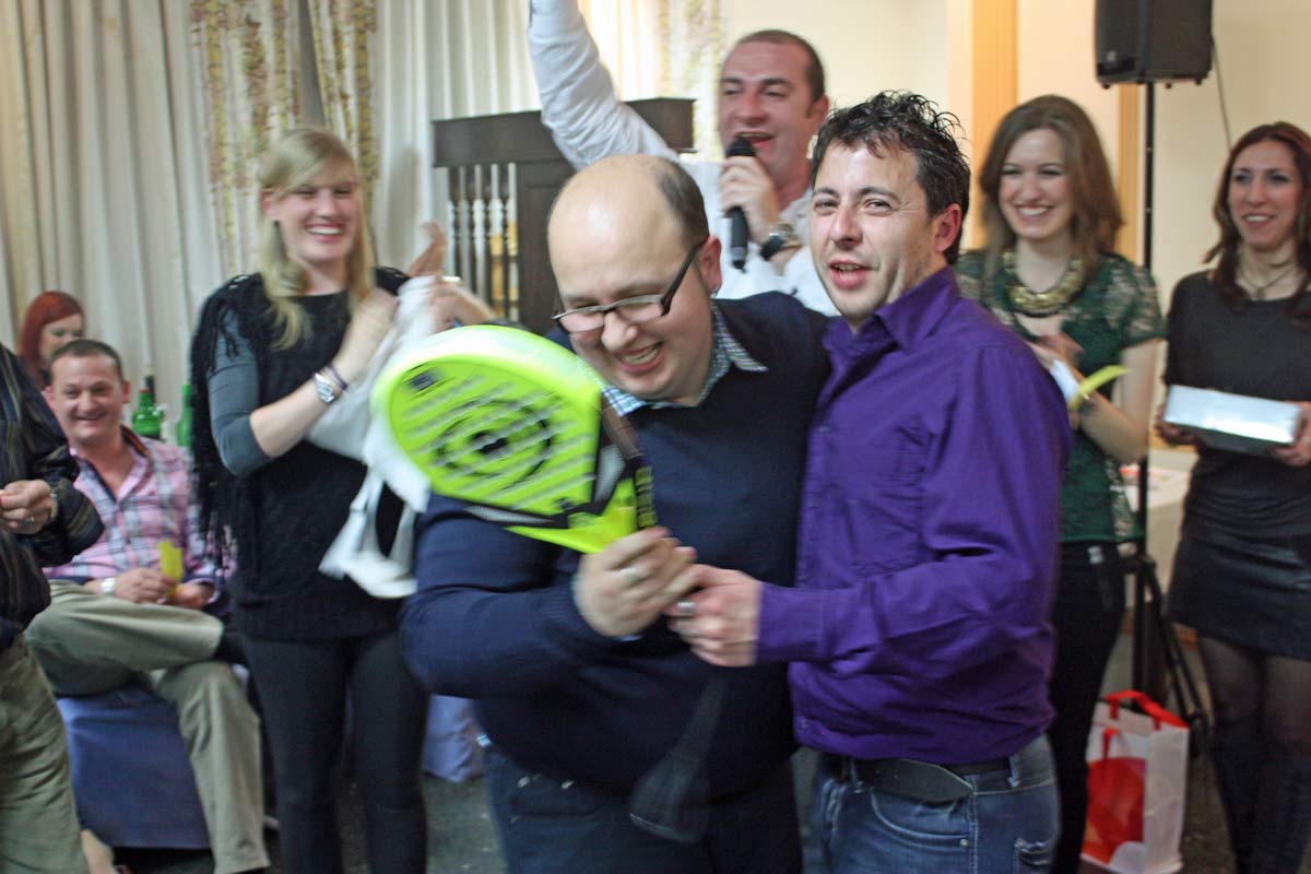 Como anécdota del sorteo de casi 100 regalos la suerte de nuestro querido Tomás, que el año que viene cuando venga a ensayar no le vamos a reconocer del «tipo fino» que se le va a quedar con tanto material deportivo con el que fué agraciado.