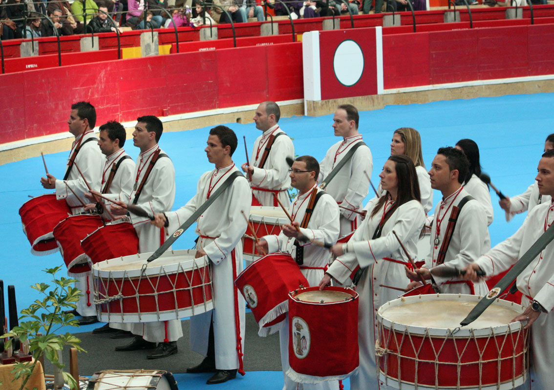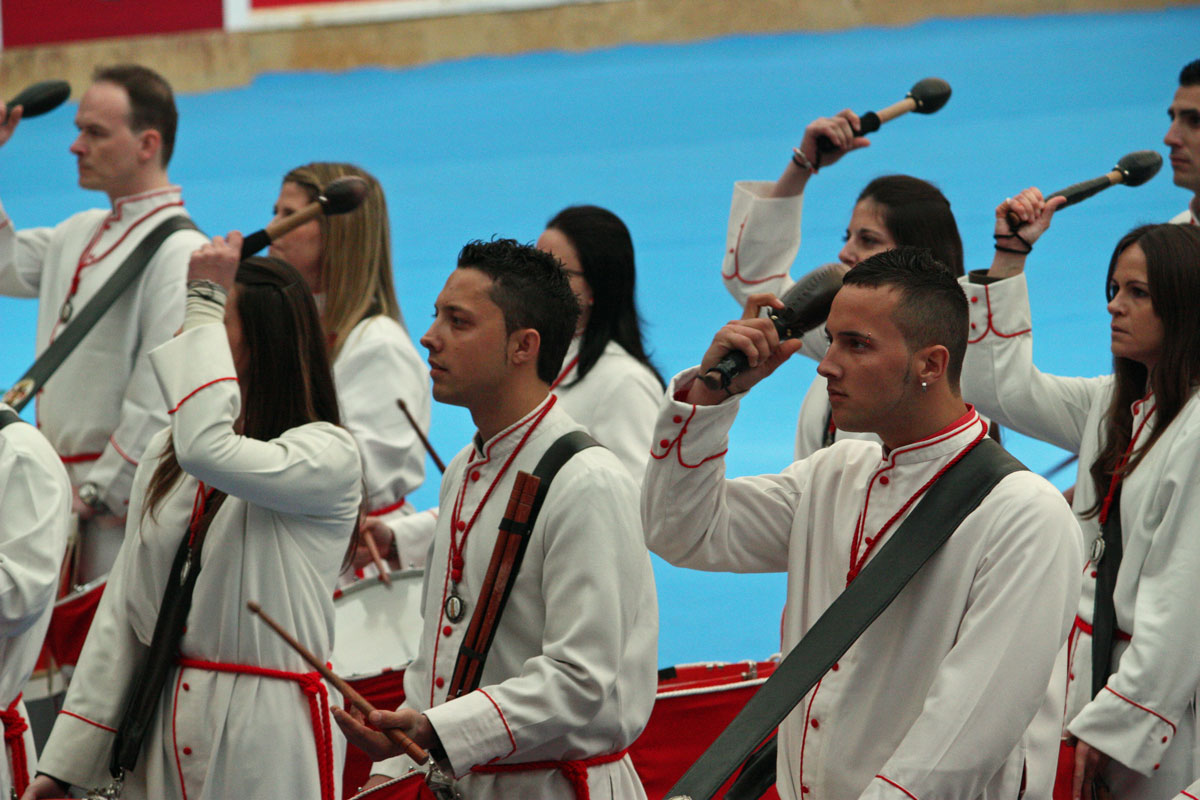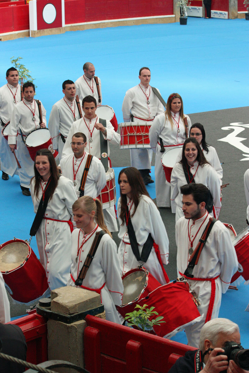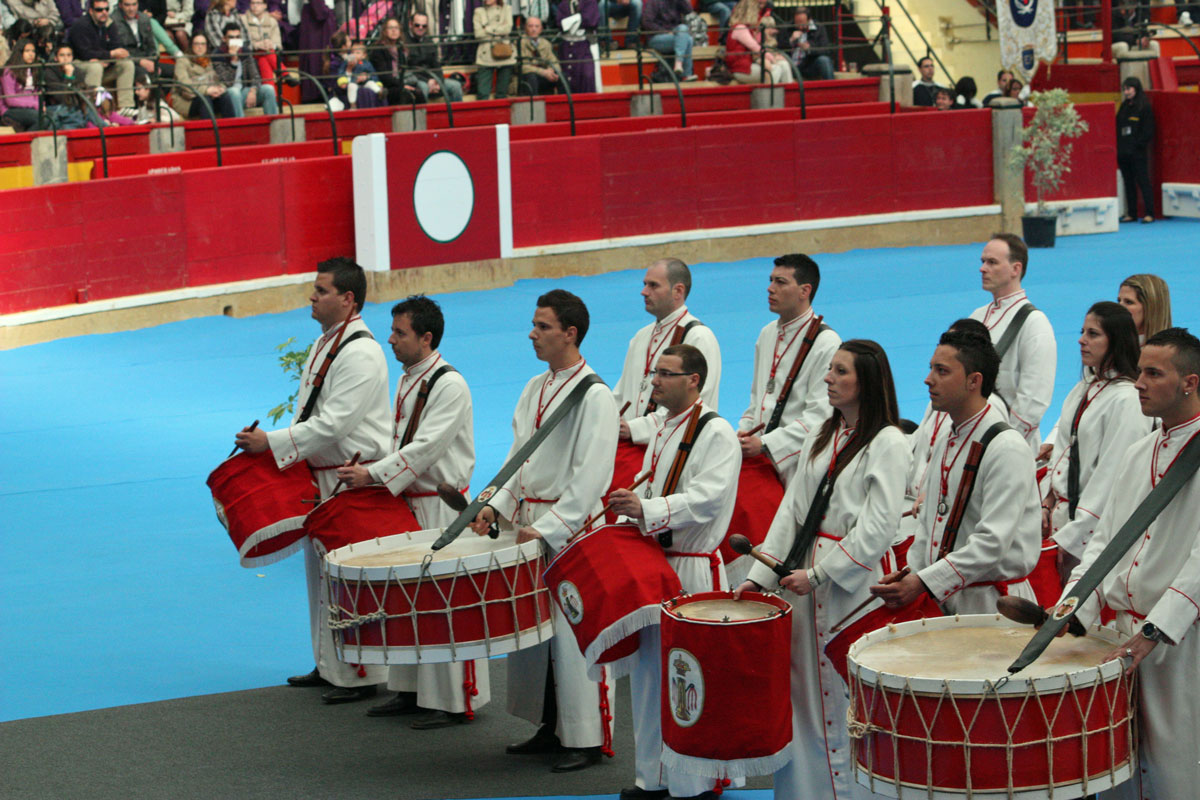 Se había iniciado el acto, con el piquete de honor, y una a una empezaban a entrar en la plaza todas las cuadrillas participantes, acercándose el momento lentamente. Y por fin, tras las primeras cuatro cofradías que participaban en la modalidad de Exaltación, y en el puesto 8, como el tendido en el que se encontraban un buen número de miembros de nuestra Cofradía. Había llegado el momento: situación, preparados, listos, y ….. a tocar; la marcha, que pasaba como una exalación, era escuchada por toda la plaza en un silencio que se rompía por los ritmos, voces, redobles, picados de gran velocidad, mazas que subían y bajaban, baquetas acompasadas a izquierda y derecha, …, que  en algo más de 4 minutos nos hacían a todos vibrar con nuestra Cuadrilla. Culminada la marcha y tras una más que correcta ejecución, nuestros chicos y chicas, iban abandonando la plaza con la sonrisa y satisfacción del toque bien realizado, plaza cuyo albero, había sido cubierto, engalanado con una moqueta azul y el escudo de la Cofradía organizadora, dando un aspecto diferente respecto a otros años.