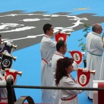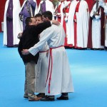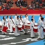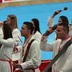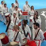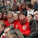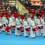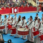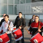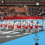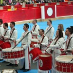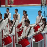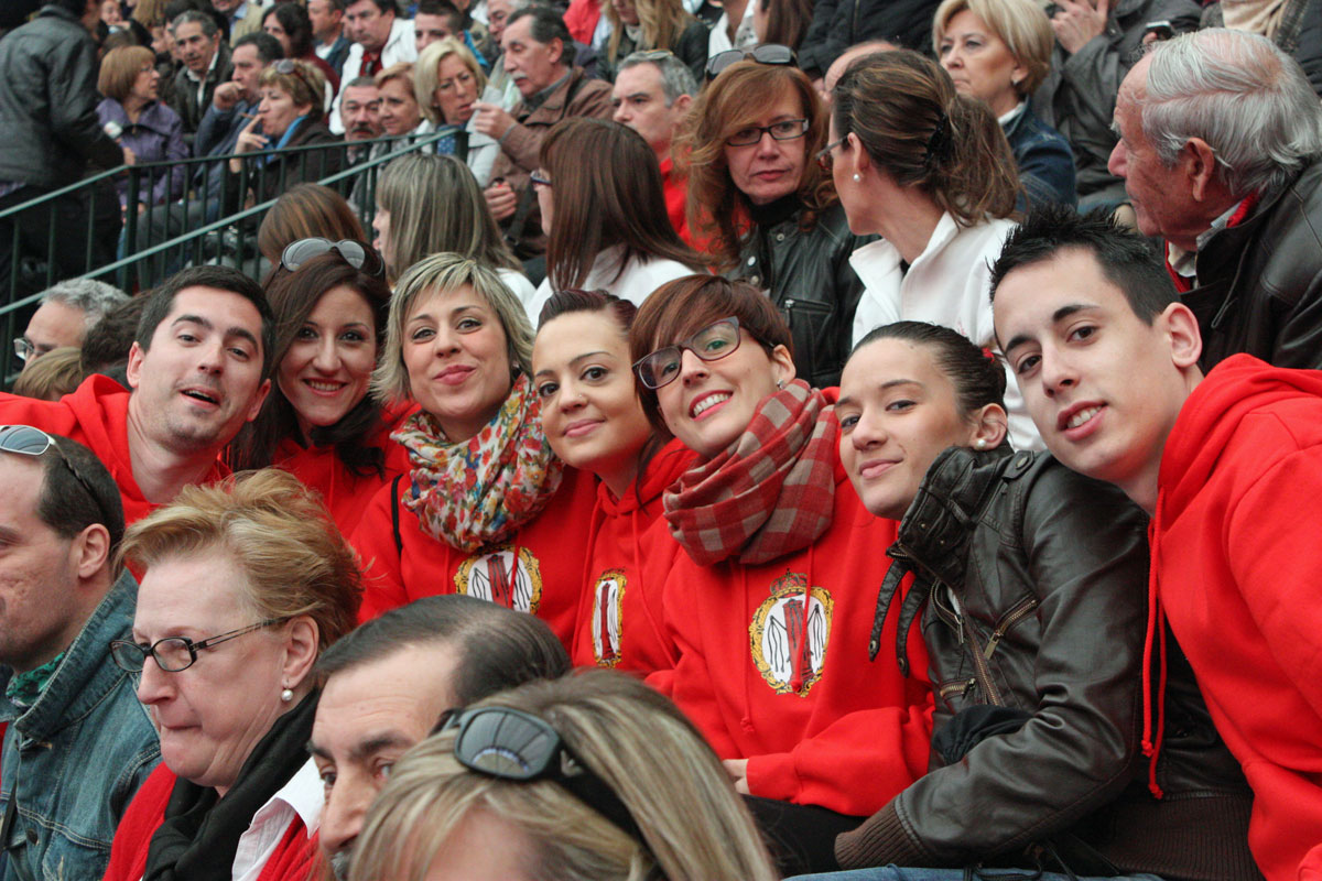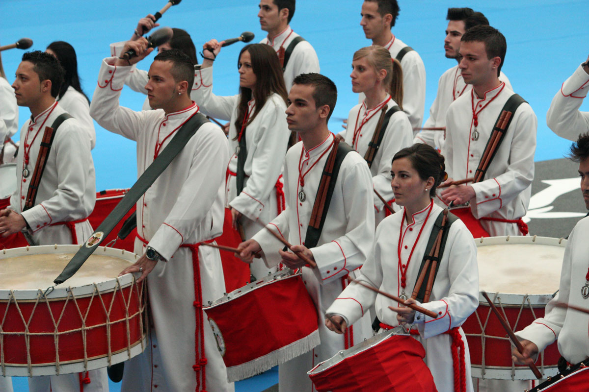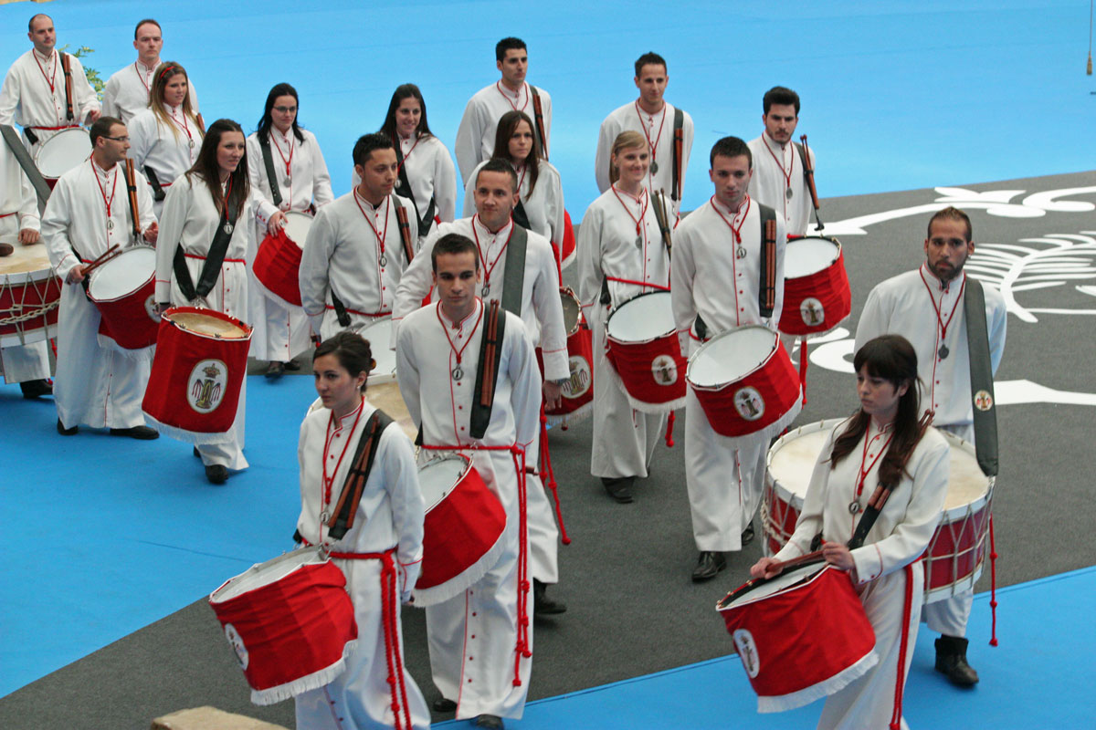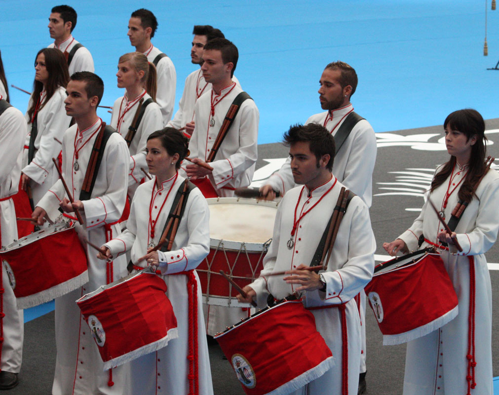 Se había iniciado el acto, con el piquete de honor, y una a una empezaban a entrar en la plaza todas las cuadrillas participantes, acercándose el momento lentamente. Y por fin, tras las primeras cuatro cofradías que participaban en la modalidad de Exaltación, y en el puesto 8, como el tendido en el que se encontraban un buen número de miembros de nuestra Cofradía. Había llegado el momento: situación, preparados, listos, y ….. a tocar; la marcha, que pasaba como una exalación, era escuchada por toda la plaza en un silencio que se rompía por los ritmos, voces, redobles, picados de gran velocidad, mazas que subían y bajaban, baquetas acompasadas a izquierda y derecha, …, que  en algo más de 4 minutos nos hacían a todos vibrar con nuestra Cuadrilla. Culminada la marcha y tras una más que correcta ejecución, nuestros chicos y chicas, iban abandonando la plaza con la sonrisa y satisfacción del toque bien realizado, plaza cuyo albero, había sido cubierto, engalanado con una moqueta azul y el escudo de la Cofradía organizadora, dando un aspecto diferente respecto a otros años.