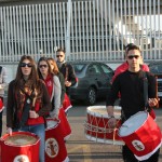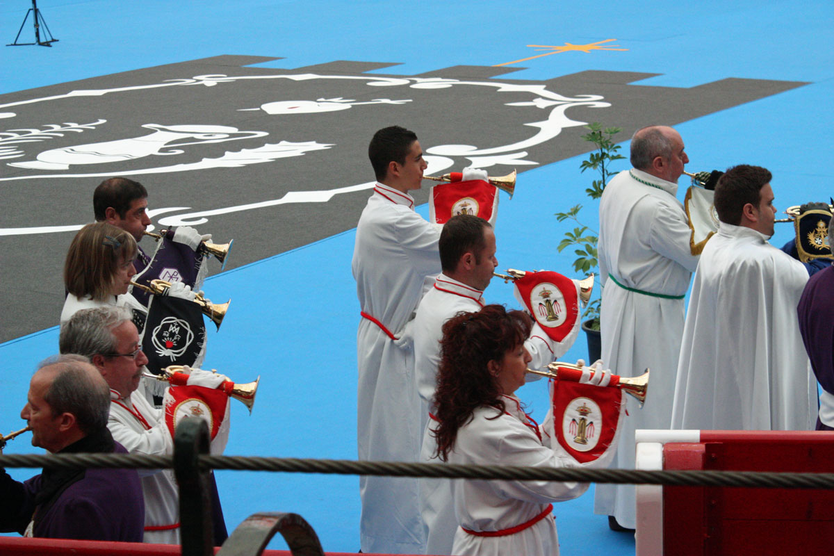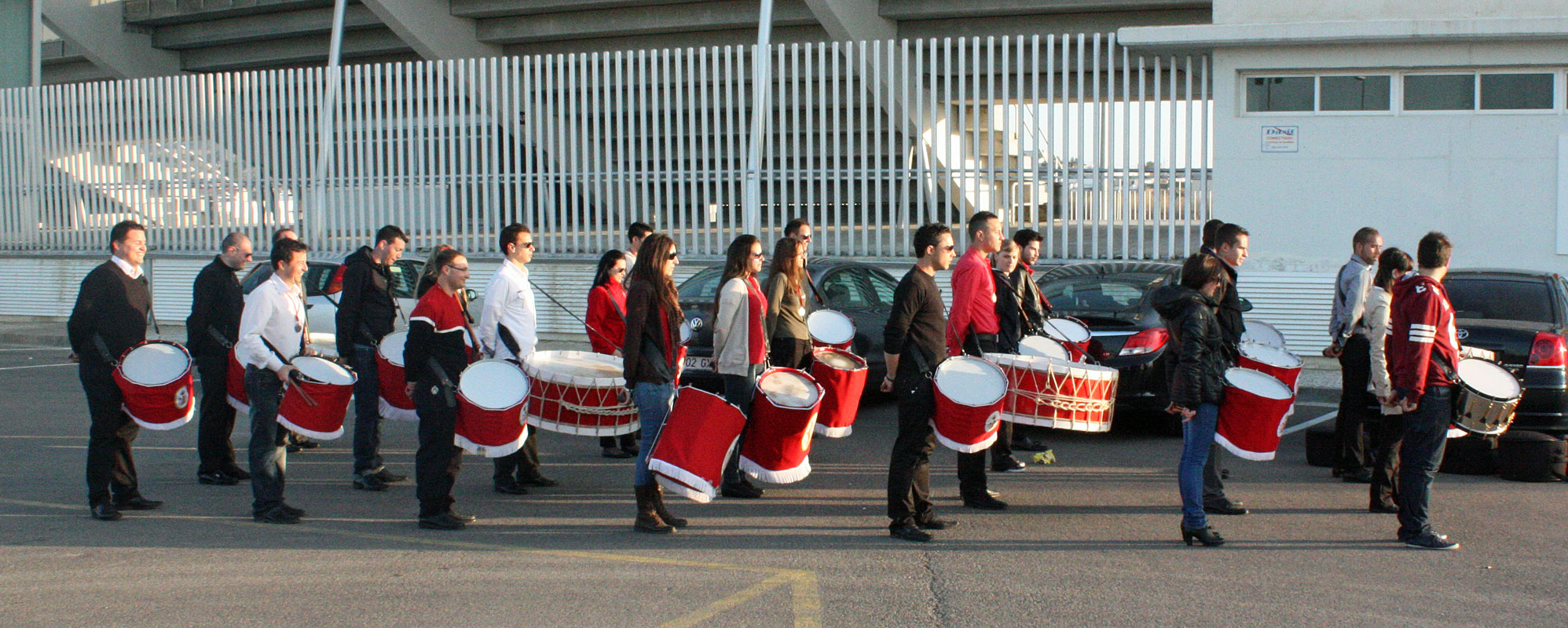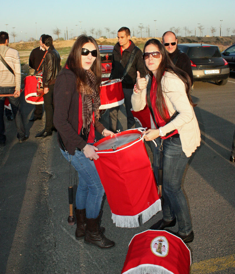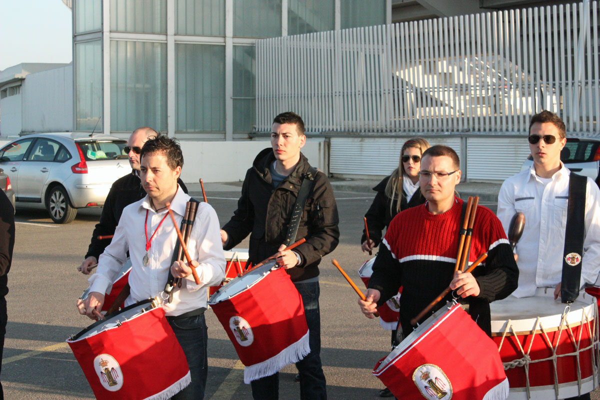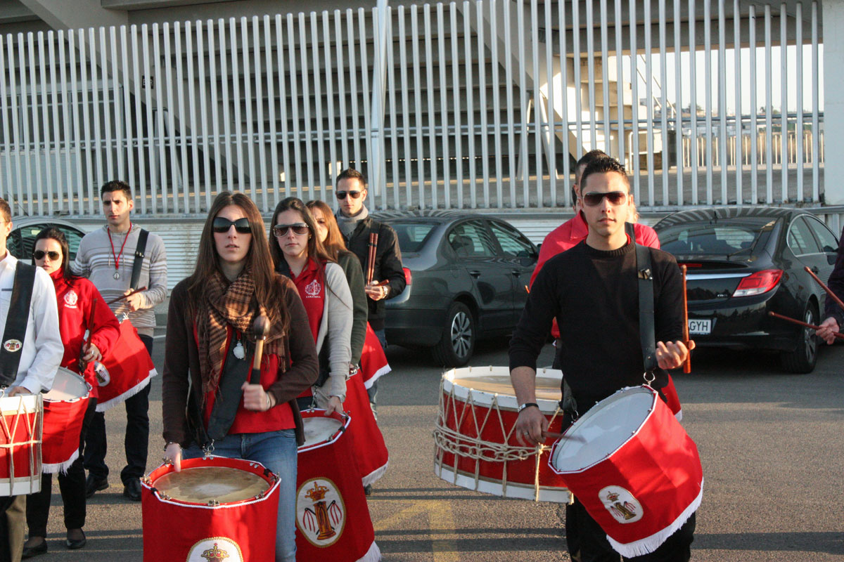 El día se iniciaba, no con poco sueño por el cambio de hora, con el tradicional almuerzo a las 07,30 h, que permitiría cargar las pilas del largo día que restaba por delante. En un ambiente de alegría e ilusión empezaban los nervios a aflorar entre los que allí estábamos, sobre todo cuando llegaba el momento del último ensayo ya pasadas las 08,30 h. Los últimos mensajes y recordatorios, mientras se engalanaban los instrumentos, daban paso al último repaso de la marcha para, posteriomente, dirigirse hacia la Plaza. Se acercaba la hora de inicio y las sensaciones de nervios se multiplicaban, reconvirtiéndose en alegrías de abrazos y besos con los miembros de otras Cofradías y Hermandades en un ambiente de fraternidad que hacía más rápido el paso del tiempo y las ganas de tocar.