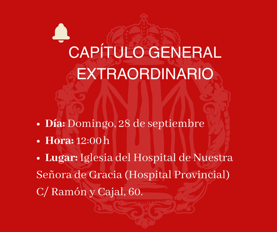 Se convoca a capítulo general extraordinario, el próximo día 28 de septiembre, domingo, a las 12 horas, en la iglesia del Hospital de Nuestra Señora de Gracia (Hospital Provincial), sita en la calle Ramón y Cajal número 60.