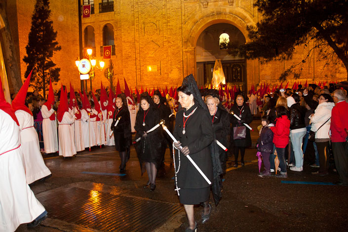 Y amaneció el Viernes Santo, con un vespertino sol matinal, desde primera hora se cubrieron los turnos de velas y monumento en San Cayetano y Santiago, para, tras una mañana de cambios climatológicos inesperados, pedrisco incluído, se daba paso a un sol radiante al inicio de la Procesión del Santo Entierro. Por fín pudimos contemplar nuestros pasos, nuestro nuevo estandarte, la restauración de los faroles, el fajín de la Virgen, ….., y pudimos salir en procesión, ya con pocas dudas sobre la climatología. Tras un largo e inóspito recorrido, propiciado por las obras del tranvía, y tras más de 4 horas de Procesión, llegábamos a Santiago para ese momento de despedida, primero con las palabras de nuestro nuevo Hermano Mayor, segundo con toda la fuerza de nuestro redoble de despedida de nuestros Pasos hasta el año próximo. La emoción y la satisfacción de ese momento resultan de dificil narración.