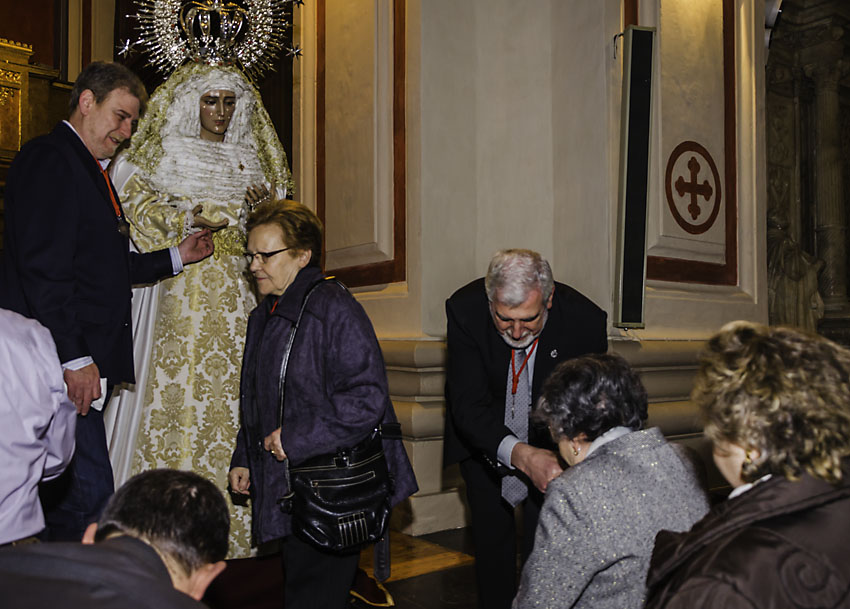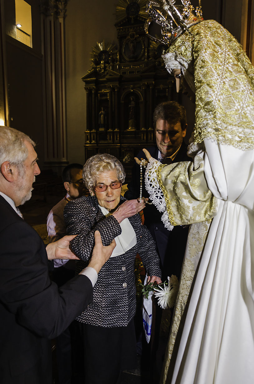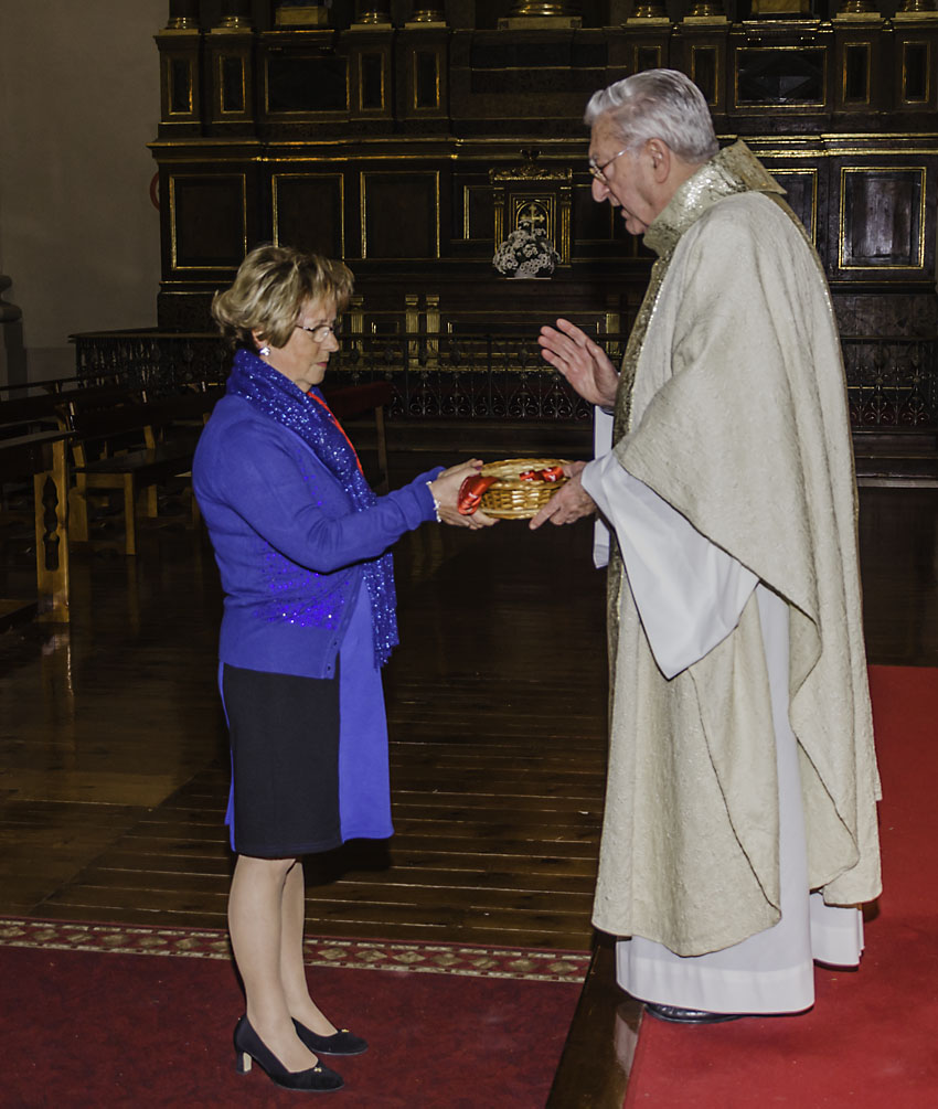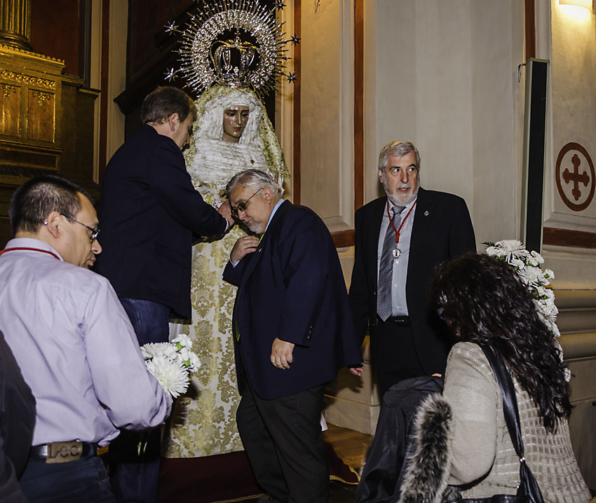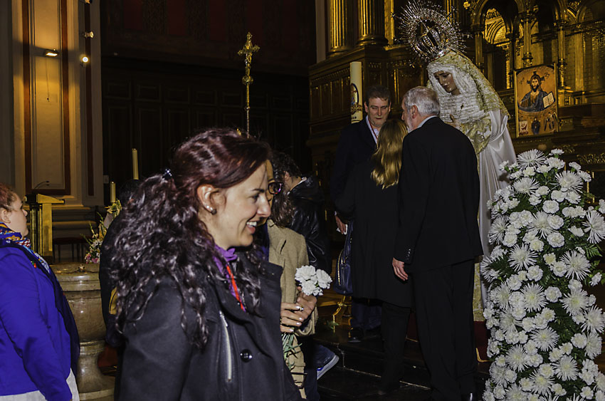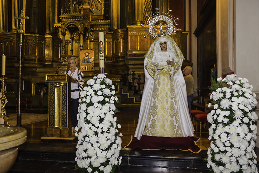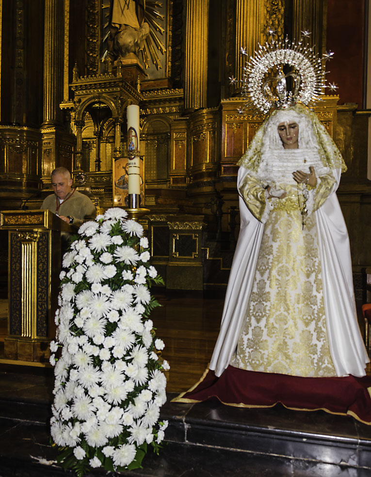 Tras la Eucaristía cantamos la Salve y se realizó el también tradicional besamanos de la imagen, tras la que los asistentes recibían una flor de las que había acompañado a la Virgen en la celebración.