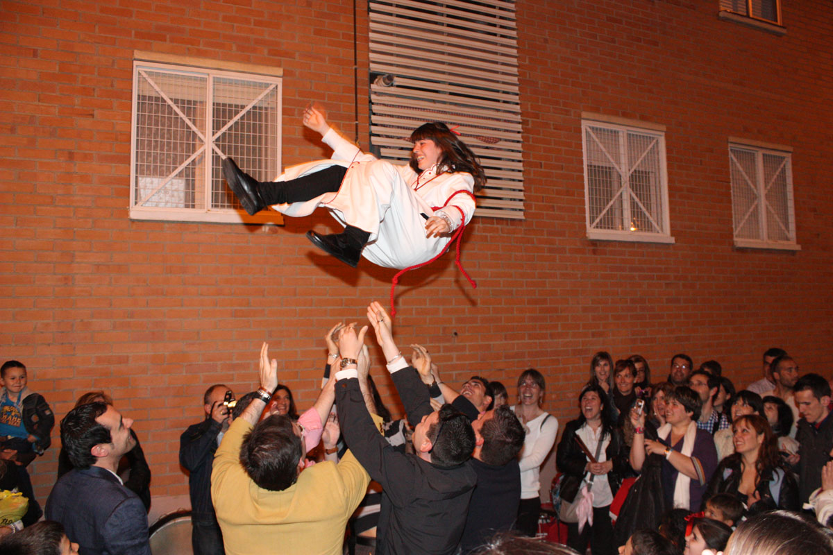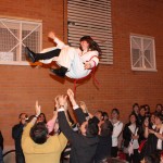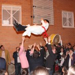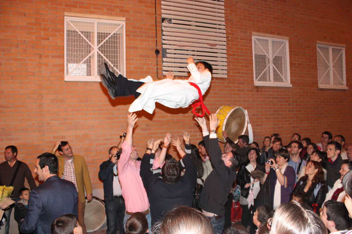 Después, tras la entrega de recuerdos, hemos salido todos al exterior y, como viene siendo habitual, se ha reconocido a los que ya era su último año en la participación de este acto, Cristina y Javier, con la entrega de una pequeña placa conmemorativa y, como no podía ser de otra forma, han sufrido el tradicional «manteo» por algunos miembros de la Cuadrilla de Mayores y otras cofrades.