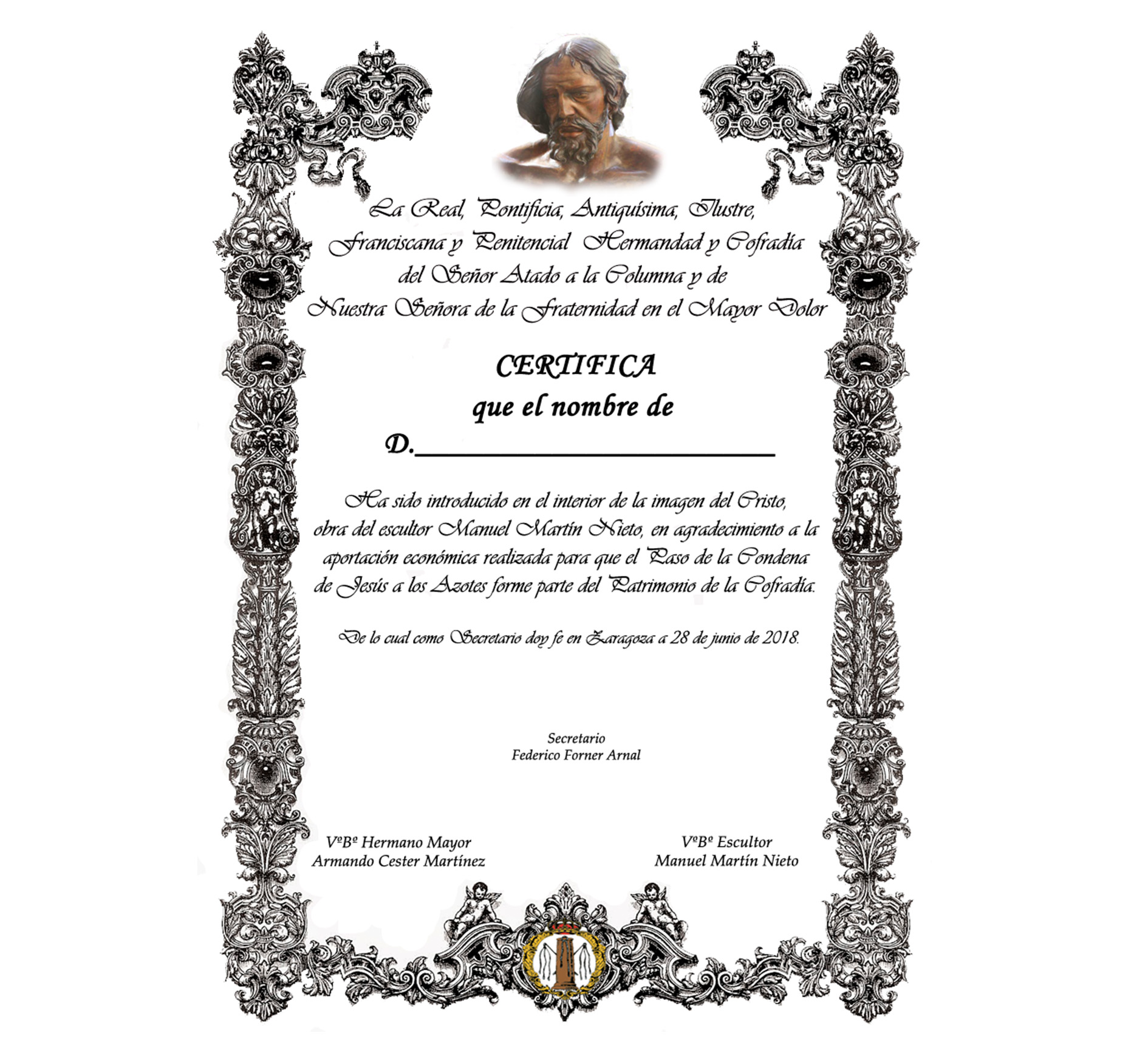 Manuel Martín Nieto, el escultor, nos ha solicitado le enviemos los nombre de los cofrades que vayan a colaborar de una forma especial (aportación de 20 euros) en el paso de la Condena. Va adelantado en la realización de la obra y necesita cuanto antes los nombres para introducirlos en la imagen del Cristo, de ahí, la necesidad de adelantar la fecha límite al jueves 13 de diciembre.