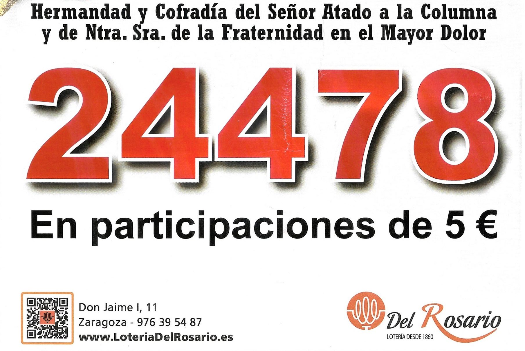 Las participaciones son de 5 euros. Se juegan 4,20 €, y el resto es un donativo de 0,80 €. El donativo procedente de la venta de lotería de Navidad es una partida muy importante para la Cofradía, por lo que si quieres colaborar y vender participaciones, te puedes poner en contacto en el correo: tesoreria@cofradiacolumnazgz.com.