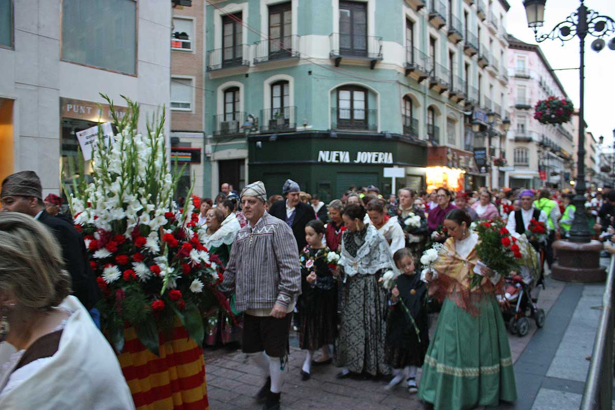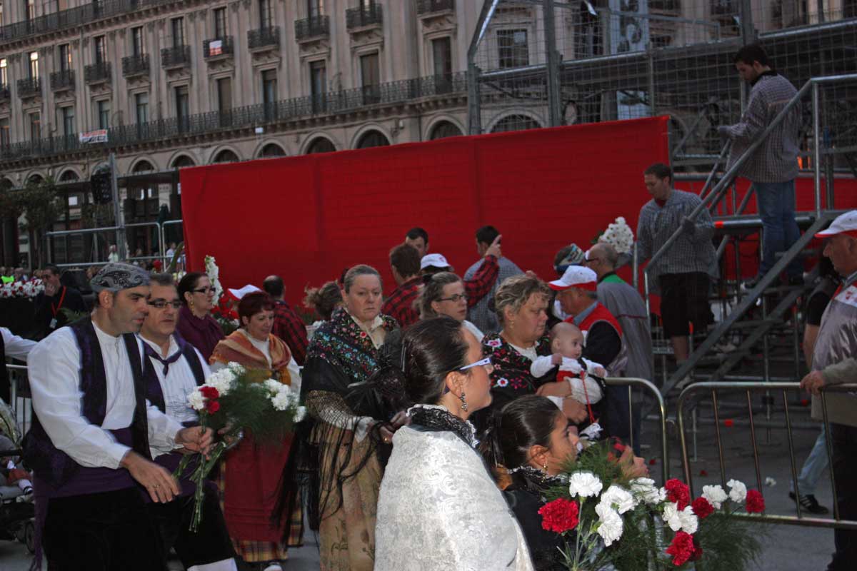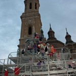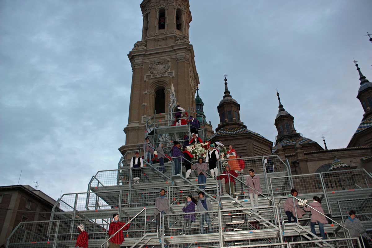 El día, que empezaba muy temprano para los que acudiamos a la cita en la calle Casa Jiménez, se había levantado fresco (17/18 ºC) y con algo de cierzo que facilitaba que las lluvias anunciadas, se alejaran de la ofrenda. Con una puntualidad inesperada, iniciabamos nuestro nuevo recorrido por uno de los viales laterales al tan comentado tranvía en el Paseo de la Independencia, para continuar por Coso y Alfonso, sin parones, sin tirones, desembocando pasadas las 8 de la mañana, cuando los primeros claros aparecian por las torres de la Basílica del Pilar, en la bandeja de la plaza con una estructura prácticamente vacía de flores y que, pasadas las horas, quedaría repleta de colorido con un puzle de flores, cestas, ramos y canastillas.