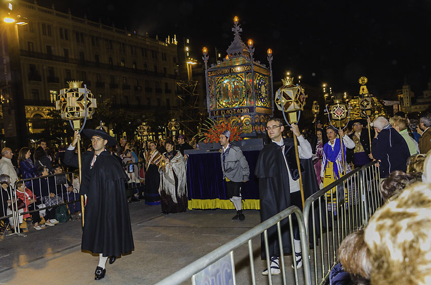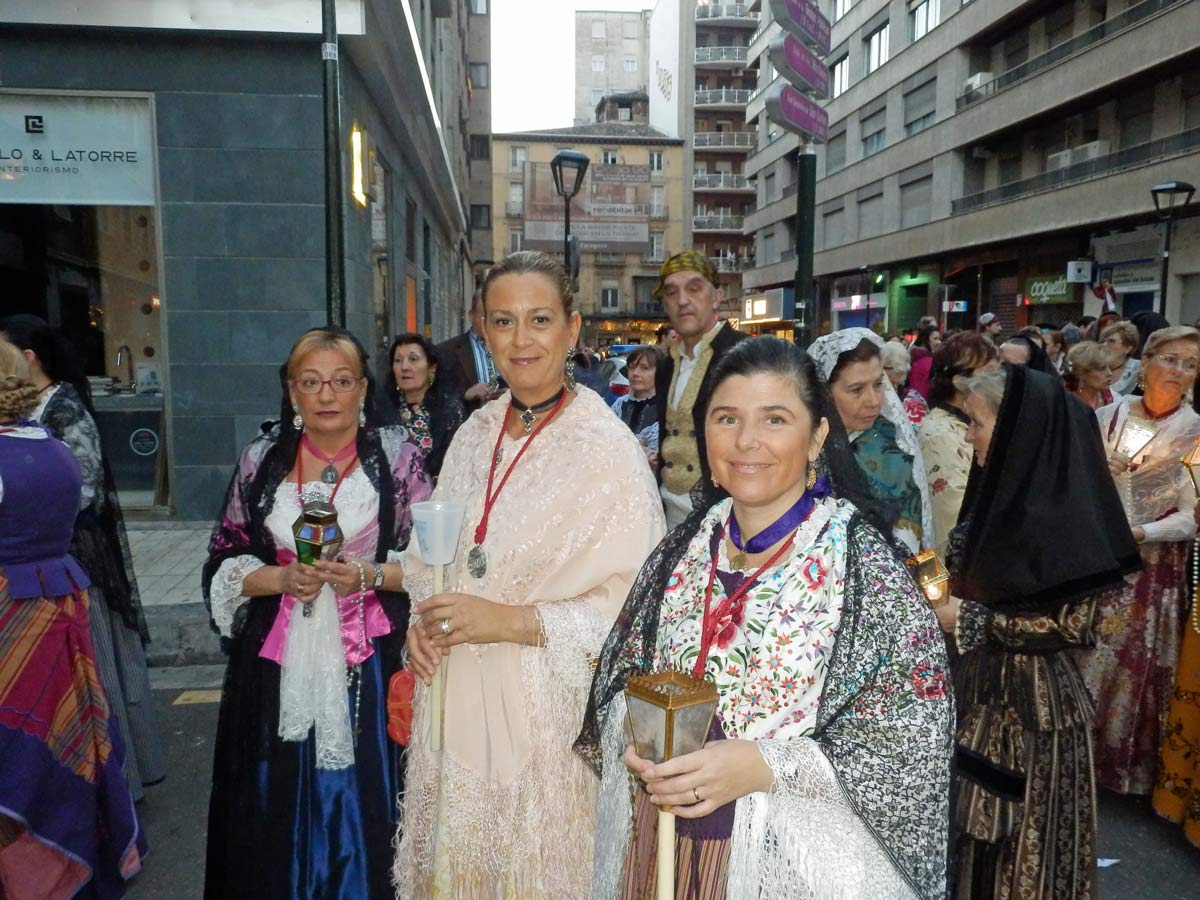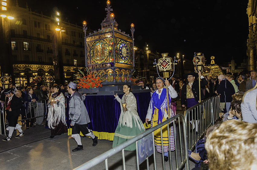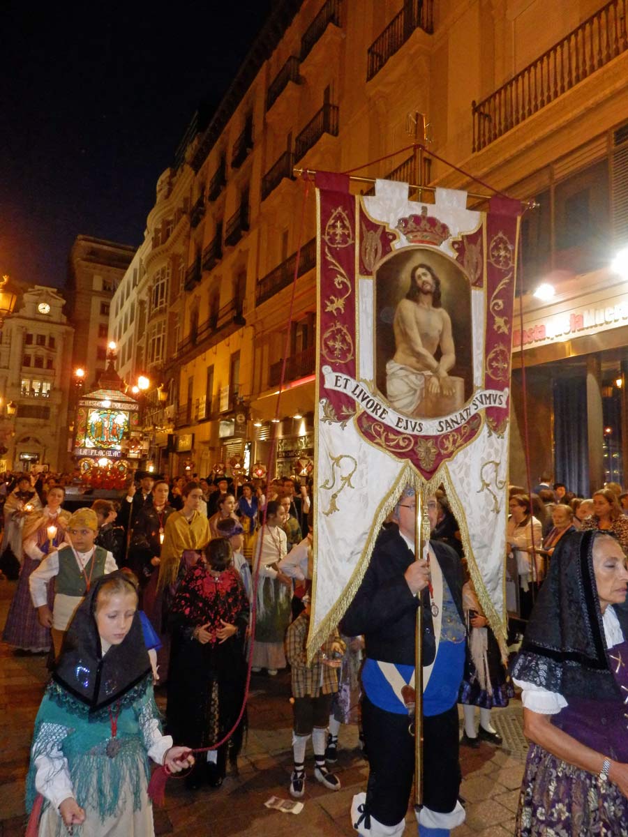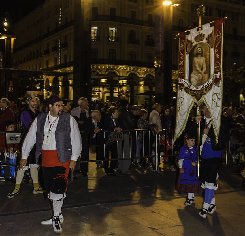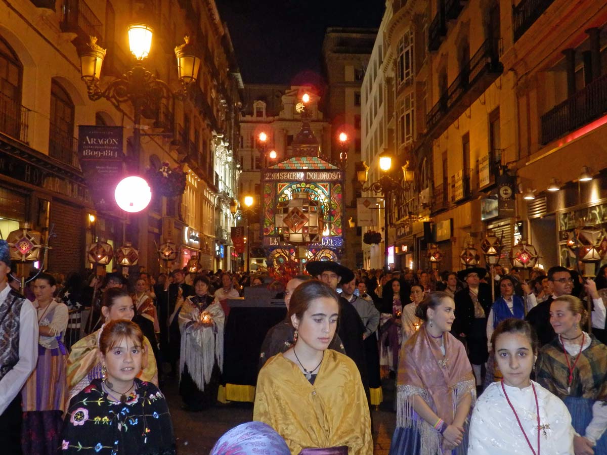 Casí 200 cofrades y amigos de nuestra Cofradía, procesionaron este año en un recorrido marcado por el buen tiempo, la gran afluencia de devotos, de turistas y curiosos. El respuoso silencio contrastaba con la megafonía, oraciones y cánticos que en todo momento nos acompañaron por las calles del centro de Zaragoza, sólamente roto en el paso por la Plaza España (ya viene siendo habitual en esta zona compartir el momento de recogimiento con las batucadas, raps, música sudamericana, etc…propias de la fiesta en la ciudad; en fín esto solo pasa en esta ciudad, que le vamos a hacer….).