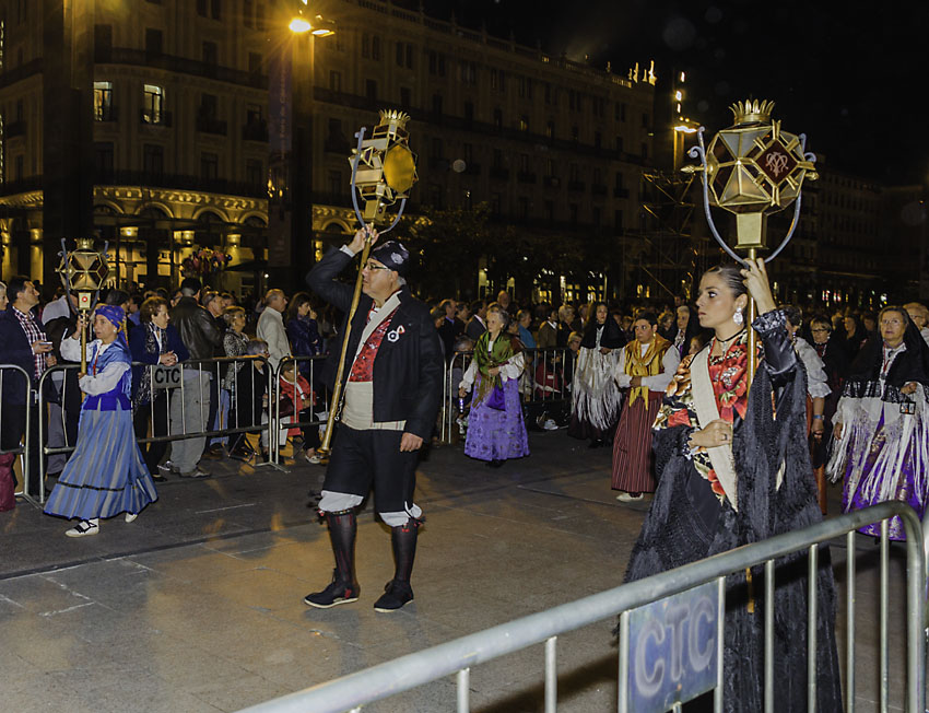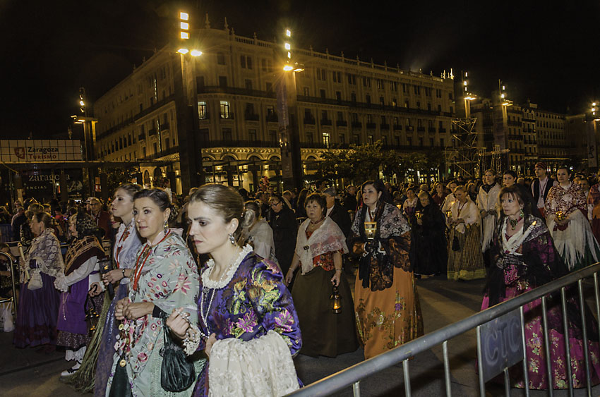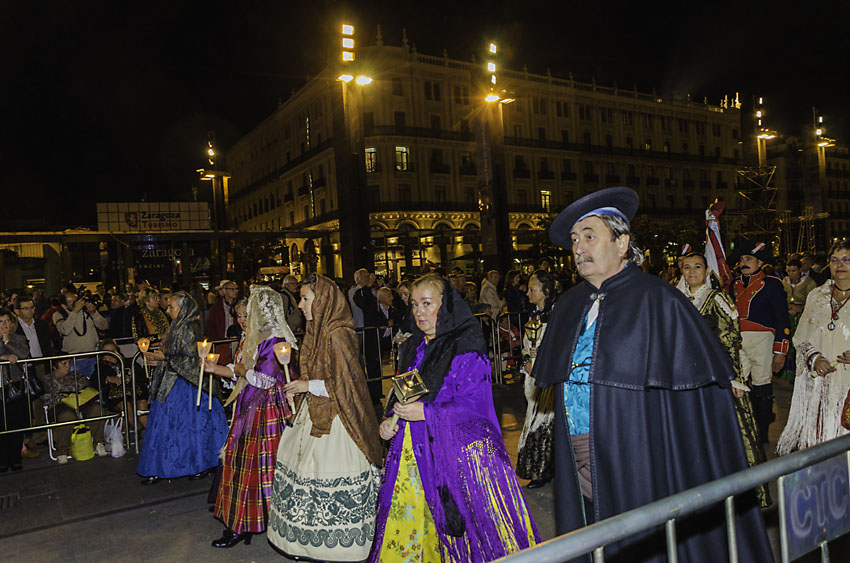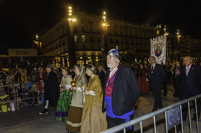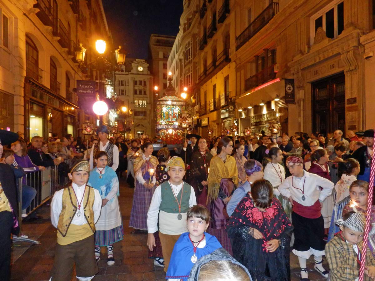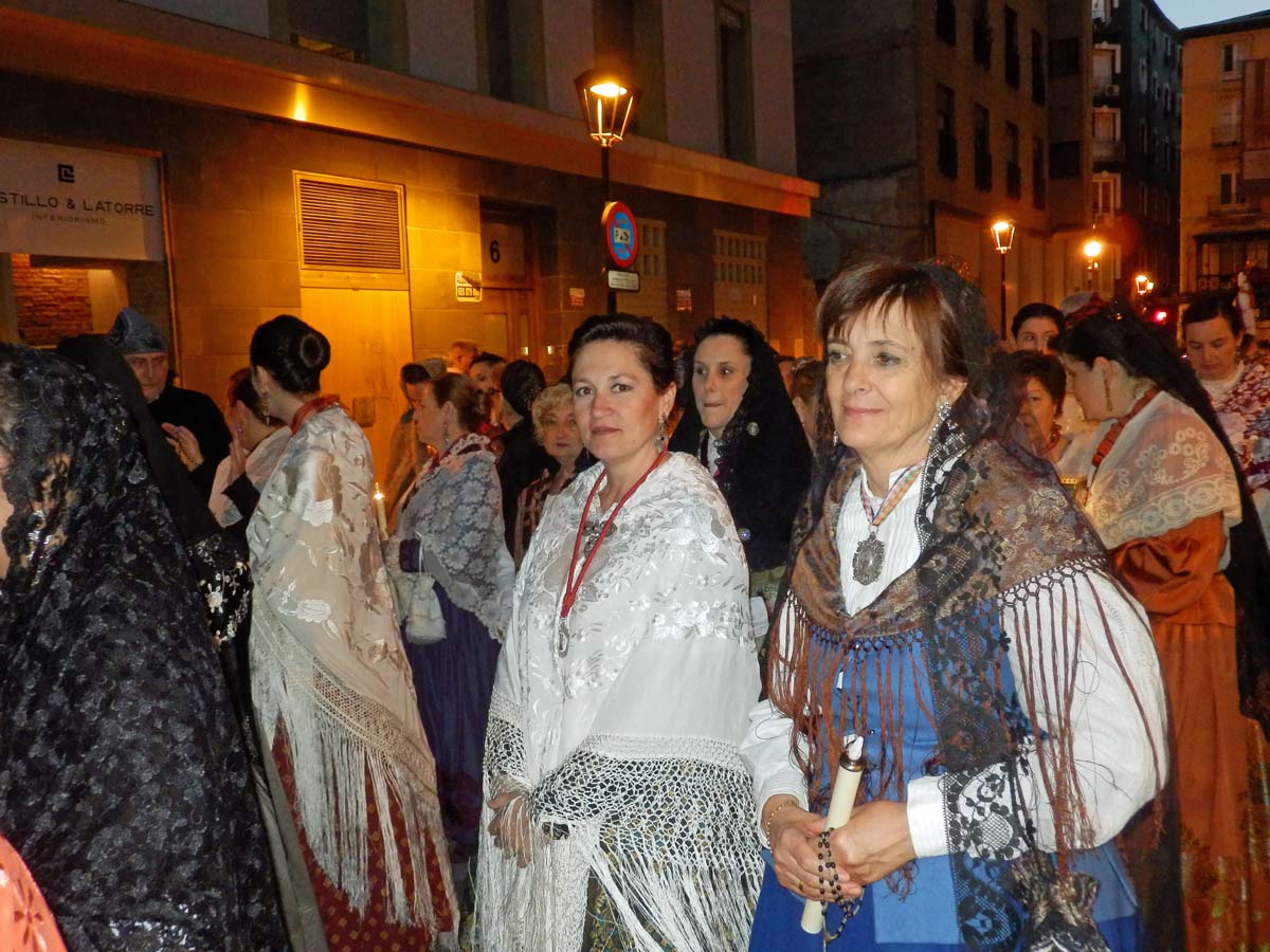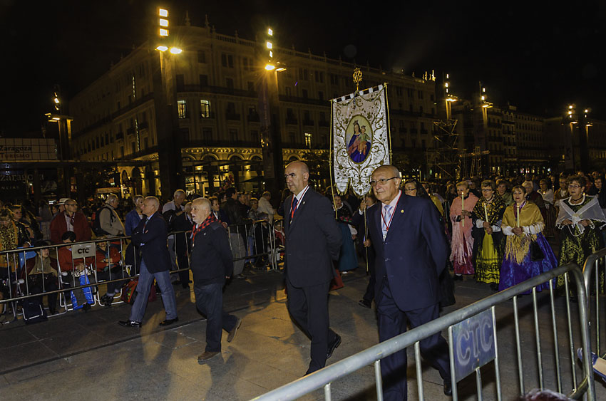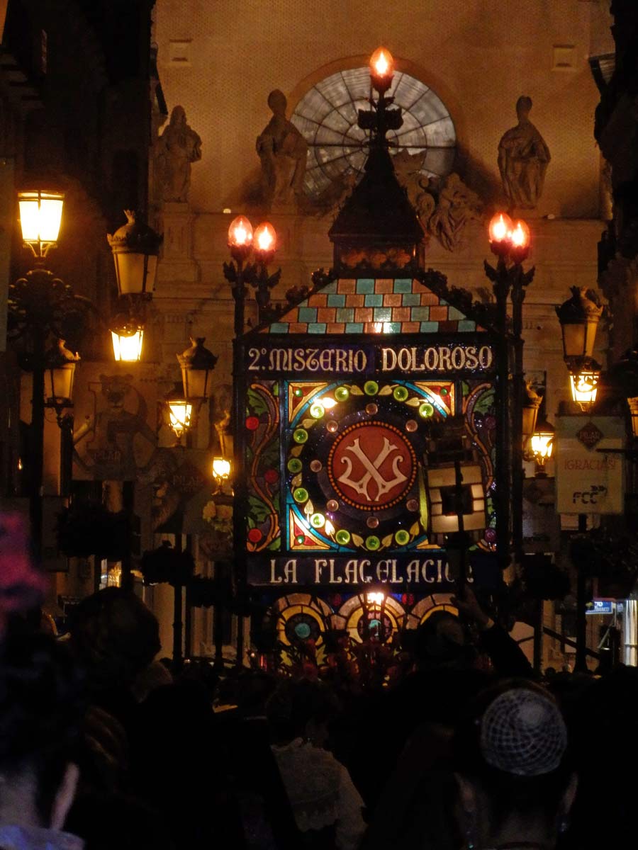 Casí 200 cofrades y amigos de nuestra Cofradía, procesionaron este año en un recorrido marcado por el buen tiempo, la gran afluencia de devotos, de turistas y curiosos. El respuoso silencio contrastaba con la megafonía, oraciones y cánticos que en todo momento nos acompañaron por las calles del centro de Zaragoza, sólamente roto en el paso por la Plaza España (ya viene siendo habitual en esta zona compartir el momento de recogimiento con las batucadas, raps, música sudamericana, etc…propias de la fiesta en la ciudad; en fín esto solo pasa en esta ciudad, que le vamos a hacer….).