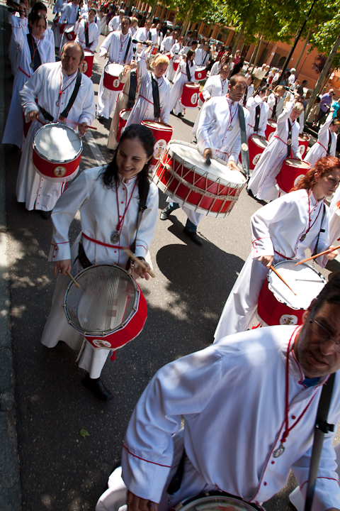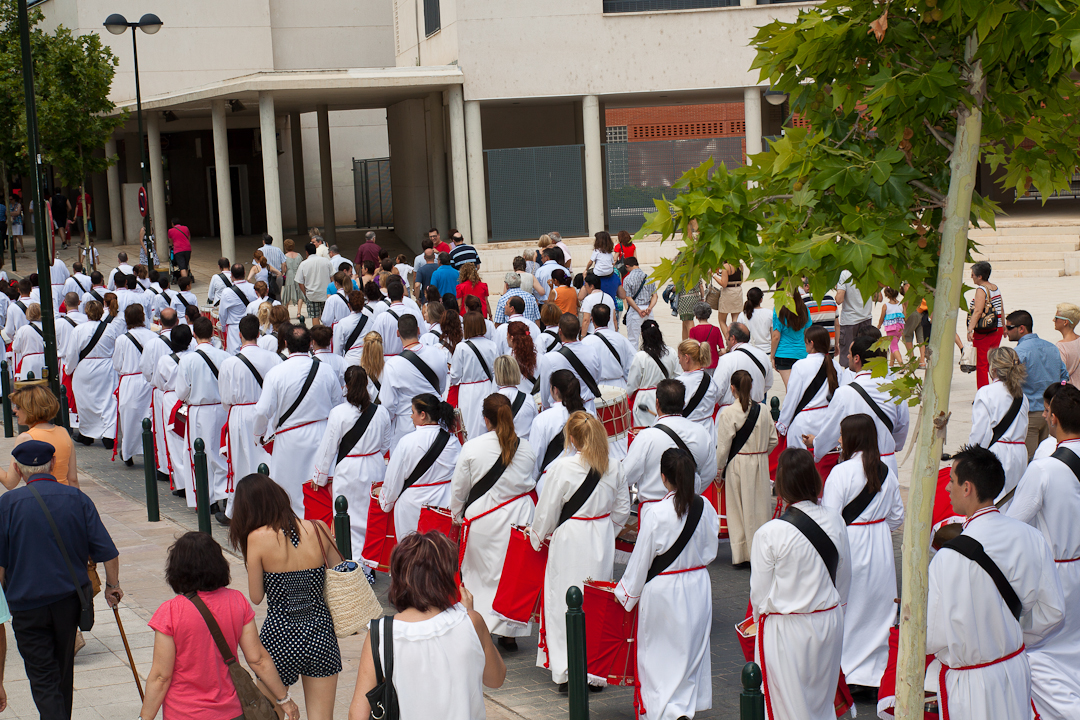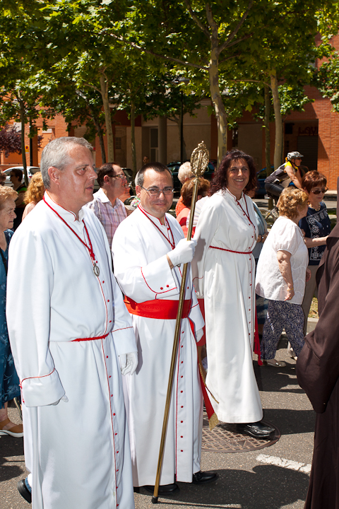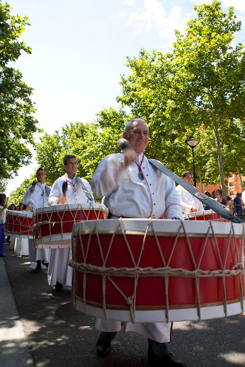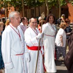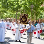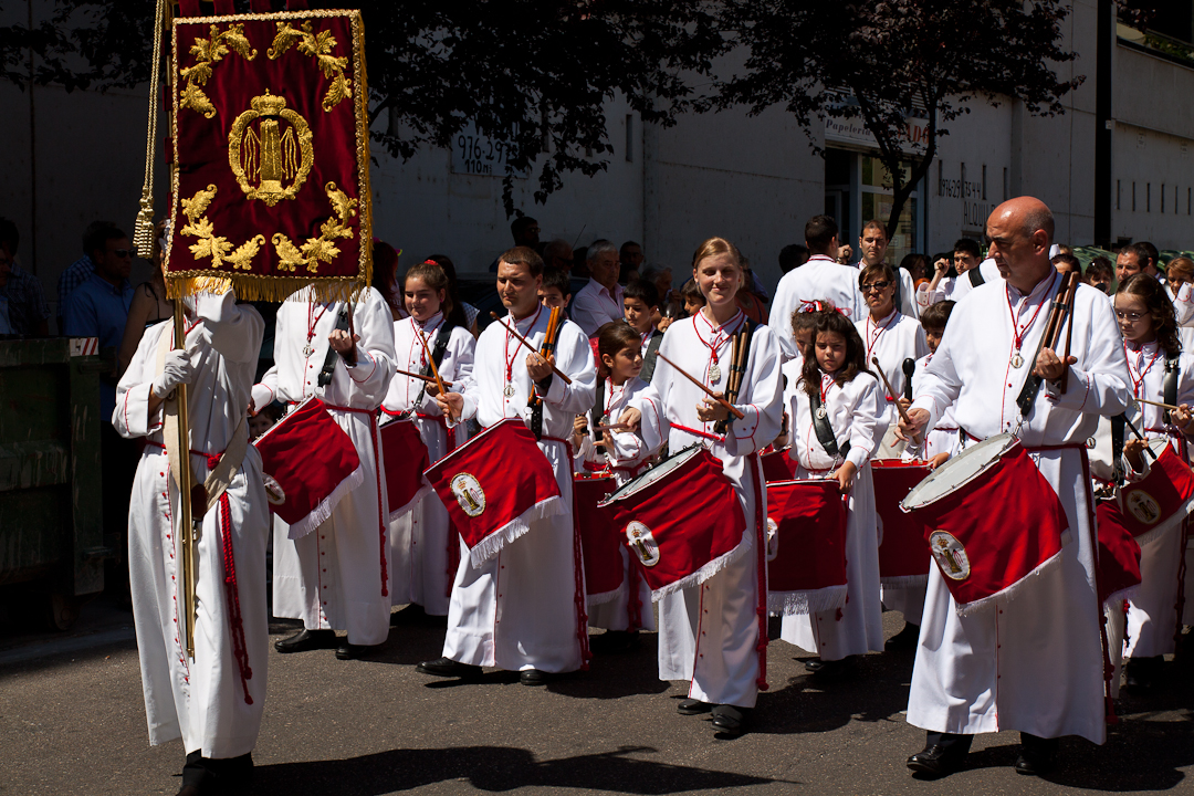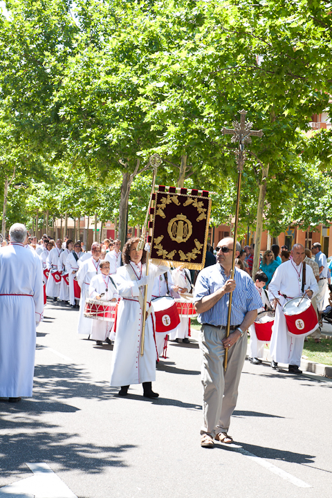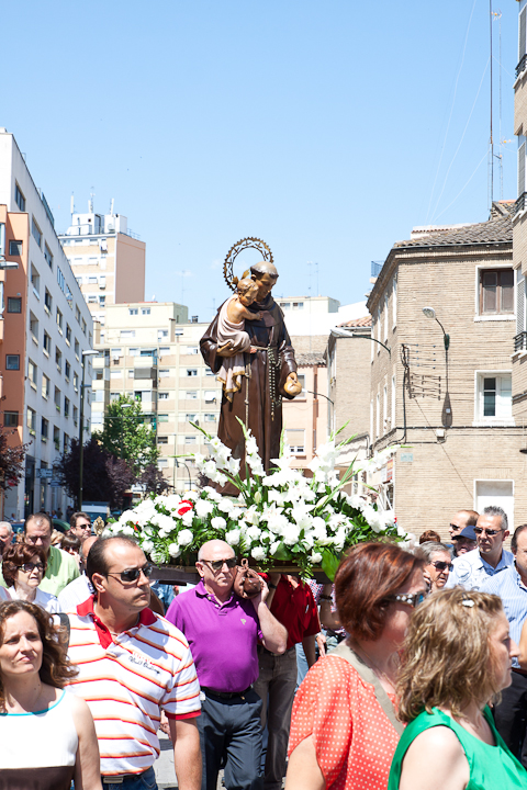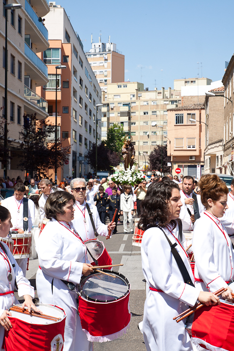 Cerca de las 12,00 h se inciba la procesión, acompañando la misma un buen número de vecinos que demostraban así su devoción al Santo. Este año, el calor habitual que sufrimos en esta participación cofradiera, se realizó por las calles del barrio más próximas a la zona del Paseo de Longares en un recorrido inédito en este año 2012. Sobre las 13,00 h regresábamos de nuevo a la Parroquia de Jesús Maestro donde, tras nuestro redoble y el «balie habitual del Santo», éste volvía a su hogar habitual.