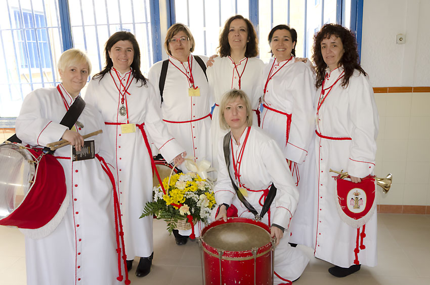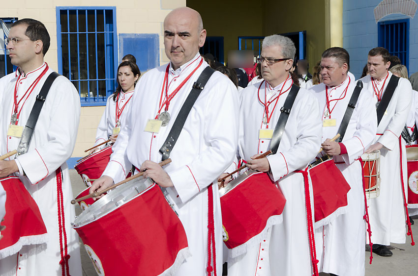 Una vez descargados los instrumentos, guitarras, y nuestra querida imagen de la Virgen colocada en su pequeña peana, y tras las consiguientes medidas de seguridad, más o menos sobre las 9,30h atravesábamos los fríos muros de la cárcel, rodeados de alambradas y medidas de control. Tras unos interminables minutos para el cierre de una puerta que quedaba tras nuestras espaldas y, con unos latidos de corazón que delataban una sensación que cuesta relatar, se abría una nueva puerta frente a nosotros, donde esperaban unas 25/30 personas, que por diferentes motivos están privados de libertad tras esos fríos muros. Ellos nos miraban, nosotros les veiámos, y nuestra Virgen era la fusión en fraternidad, de reclusos y cofrades.