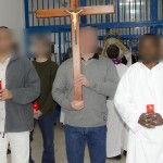 Los internos se acercaron a la peana con nuestra imagen de la Virgen de la Fraternidad en el Mayor Dolor, haciéndose con ella como si la hubieran portado toda la vida. En ese momento inicamos las catorce paradas del Vía Crucis a través de los diferentes modulos del recinto, pasando por la enfermería y por el patio en donde había un mayor número de reclusos. Eran ellos, quien con un sentimiento vivo y de corazón, transfromaban las estaciones en el relato de su vida privada de libertad haciéndonos participes de sus oraciones.